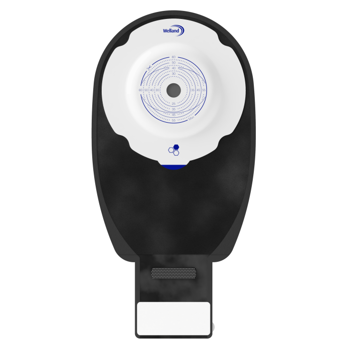 Welland Medical, Aurum Plus, Ostomy device one-piece, drainable, black, split soft cover, maxi plus, soft convex, 60mm plateau, 13mm starter hole cuts to 60mm